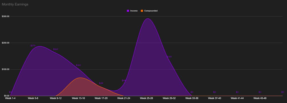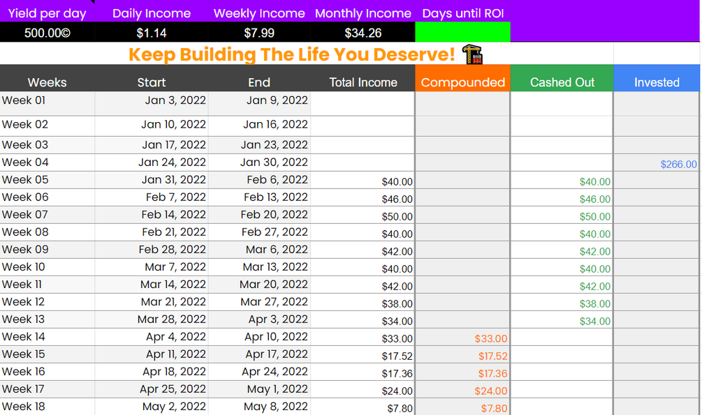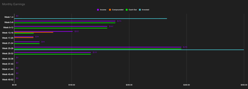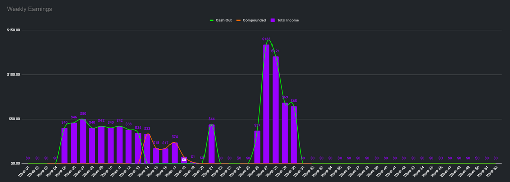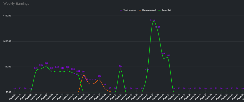 Table to quickly view how much you've made each week, plus a comparison between your weekly cashouts versus your weekly compounding.